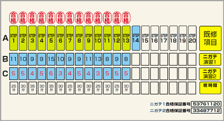 全段階に「合格印」が表示され、さらに「ニガテ演習1」「ニガテ演習2」の再復習を終わらせると、画面に「合格番号」が表示されます。それはその範囲からどのような試験問題が出されようと合格点が取れる実力がついているという証です。(「ニガテ演習」はテスティング段階での未知または誤答した問題全てをまとめて復習できます。「既修項目」は全問題の総復習ができます)